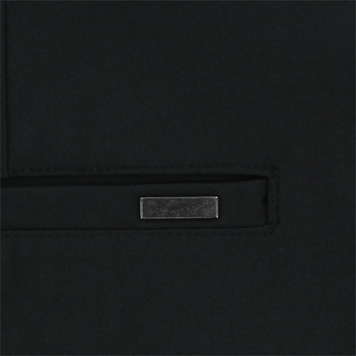 - PlayDry stretch pocketing, gunmetal Shark logo plate on back right pocket
